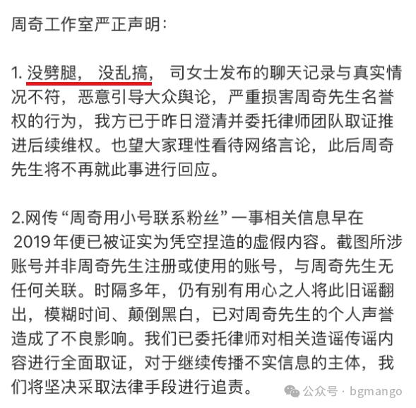 丢人呐 ~ 周奇发声明了,否认劈腿,间接官宣了跟向涵之的恋情。说真实情况不司晓迪说的那样(所以没有明确否认他们的关系)。说联系粉丝接机是假的(感觉他对这事更在意。)现在男明星这种声明真是毫无公信力了。