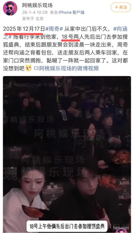 但是,娱乐记者发布,拍到了起码在 2025 年 12 月,周奇和向涵之是在一起的。12 月 17 日,向涵之去他家过夜,第二天一起去参加搜狐盛典,结束后又一起回家。也就是说,周奇肉体跟向涵之在一起的时候,手机在撩着司晓迪。